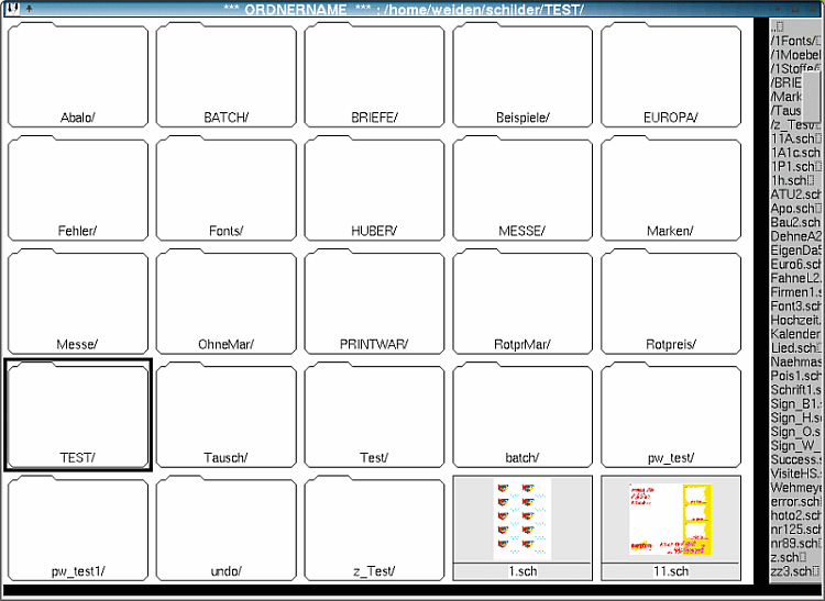 Abteilungen sind sozusagen Unterverzeichnisse, in denen Schilder später abgelegt werden können. Sie sind durch einen Schrägstrich (slash) "/" am Ende gekennzeichnet und deswegen in der normalen Fileselect-Box leicht als Abteilung zu erkennen. Eine Abteilung "batch/" ist immer vorhanden. Diese dient zur Stapelverarbeitung und soll nicht anderweitig verwendet werden. Sie können aber jederzeit eine neue Abteilung (z. B. "Schuhe/") anlegen; tippen Sie in einem Eingabefenster folgende Zeile: