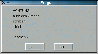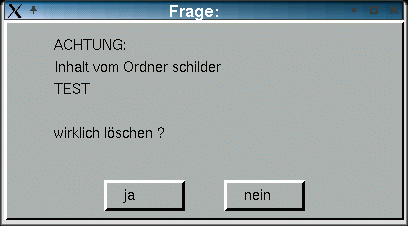 Nun kann gewählt werden ob auch der Ordner gelöscht werden soll. Ja löscht, nein beendet den Löschvorgang ohne Wirkung. Wenn Sie nun einmal mit POS1 aus der Schilder-Übersicht herausgehen, wird bei erneutem Aufrufen der Übersicht der gelöschte Ordner nicht mehr angezeigt.