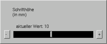 Klicken Sie jedoch den Punkt Höhe XXX an, so können Sie mittels Schieberegler jede gewünschte Schrifthöhe in mm-Schritten frei einstellen. Der Regler reicht dabei von etwa der Hälfte bis etwa dem Doppelten der vorher eingestellten Höhe.