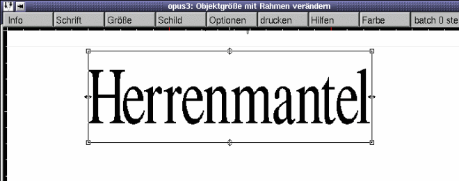 Sie können nun die Eckpunkte mit gedrückter linker Maustaste verziehen, bis der Rahmen die gewünschte Größe (und Position) hat. Mit der rechten Maustaste wird die Aktion abgeschlossen und das Objekt neu aufgebaut. Das ist übrigens die beste Möglichkeit die Bildgröße nachträglich zu ändern. Sollte z.B. ein Bild für den Druck zu klein sein (weil etwa in 150 DPI gescannt 300 DPI Ausgabe) tippen Sie den Menüpunkt Höhe mit der rechten Taste an, danach mit der linken Maustaste auf das Bild und ziehen Sie das Bild in die gewünschte Größe. Mit der rechten Maustaste schließen Sie den Vorgang ab. Diese Funktion ist auch auf verzerrte und gebogene Zeilen anwendbar.
