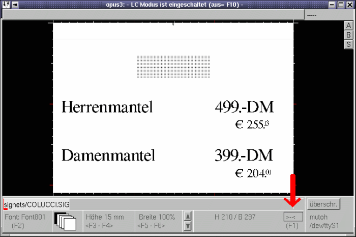 In der Praxis sehr viel verwendet wird der LC-Modus.Er dient zum Bearbeiten (Verändern) gleichartiger Schilder (=Masken). Sobald dieser Menüpunkt angeklickt wird, erscheint ein Eingabebalken und Sie können das Programm mit der Tastatur steuern. Zum Ändern des bestehenden Textes wird einfach im Eingabebalken mit der Taste Pos1 der ursprüngliche Text gelöscht und ein neuer Text über Tastatur eingegeben. Mit den Cursor-Tasten (Richtungs-Pfeilen) können Sie durch das gesamte Schild gehen, wobei Textänderungen nach jedem Zeilenwechsel am Ort sofort angezeigt werden. Die Maus hat während des Arbeitens im LC-Modus nur eine eingeschränkte Funktion, der Mauspfeil verschwindet und wird zu einem gebogenen Doppelpfeil. Beim Beenden des LC-Modus hat die Maus wieder alle Funktionen. Wollen Sie ein Signet oder Bild wechseln, drücken Sie, sobald die betreffende Zeile im Eingabebalken ist, einfach die ENTER-Taste. Nun erhalten Sie die Signet- oder Bilder-Übersicht, die es Ihnen erleichtert das gewünschte Signet/Bild zu wählen und auf dem Schild auszutauschen (mit linker Maustaste oder mit den Cursor-Tasten und ENTER).