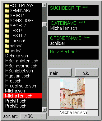 Wollen Sie also ein Schild laden, klicken Sie den Menüpunkt laden an und wählen Sie in der Fileselect-Box (evtl. mit Scrollbalken-Hilfe) durch Anklicken den Schildernamen aus. Sobald Sie "ok." anklicken, wird das bestehende Schild vom Bildschirm gelöscht und das neue geladen.