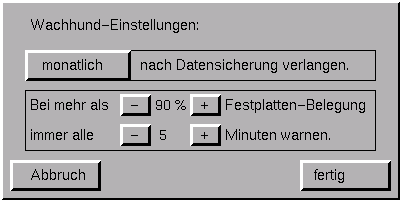 Tippen Sie das "dog"-Programm (in der Programm-Leiste) an und stellen Sie ein, wie oft der Computer zur Datensicherung auffordern soll (Vorschlag: monatlich)