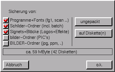 Hier kann man angeben (linke Spalte) was alles gesichert werden soll, man kann sagen wohin (ggf. gepackt) gespeichert werden soll und man bekommt angezeigt, wie viel Speicherplatz (z.B. auch Anzahl Disketten) benötigt wird. Sinnvolle Voreinstellung ist Programme, Schilder und Signets auf Disketten sichern. Es könnte auch auf die gleiche Festplatte, oder über ein Netzwerk auf einen anderen Rechner gesichert werden.